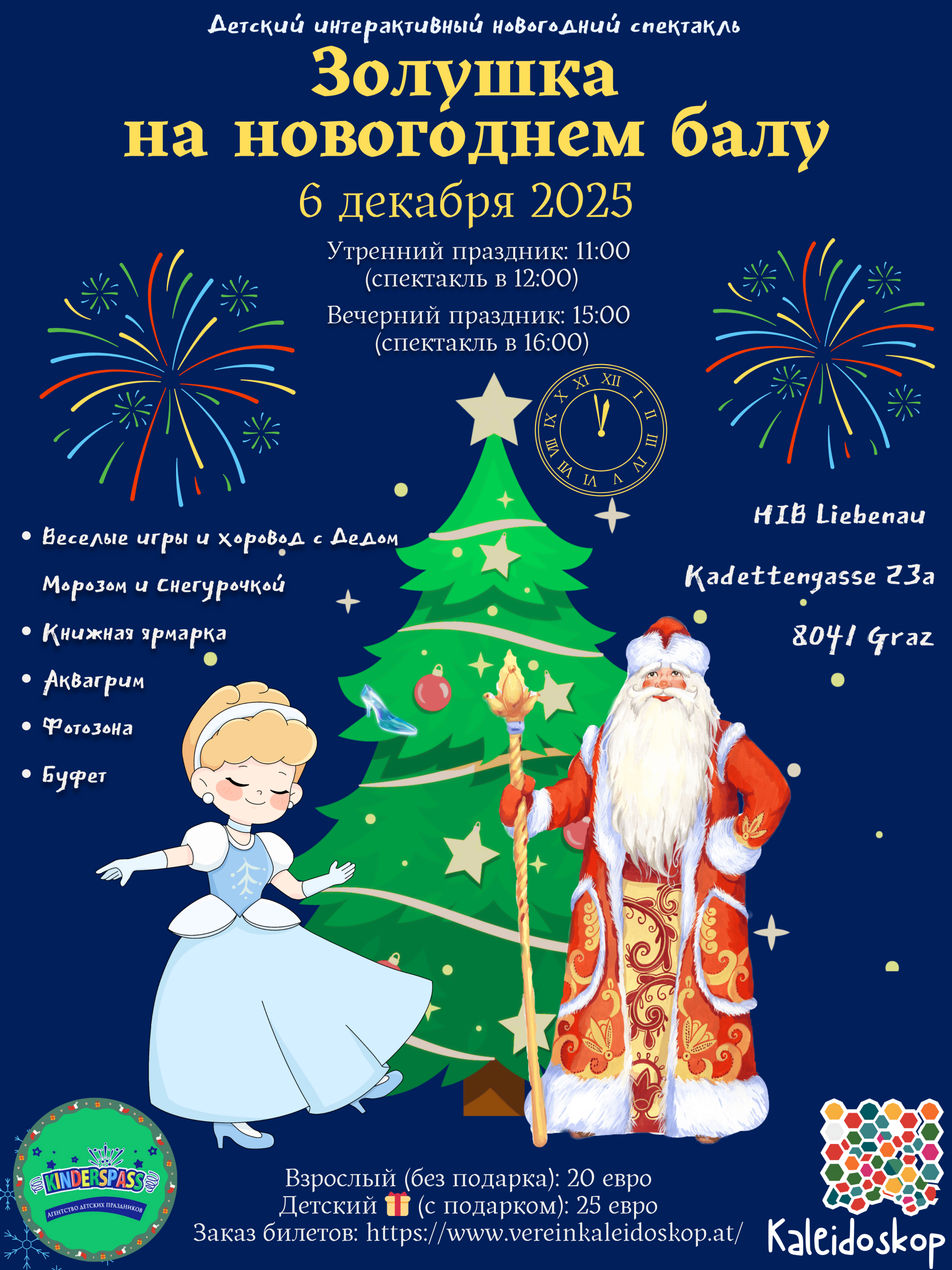 В программе: аквагрим, книжная ярмарка, хороводы с детьми, новогодняя фотозона, буфет, игры с героями сказки, Дедом Морозом и Снегурочкой